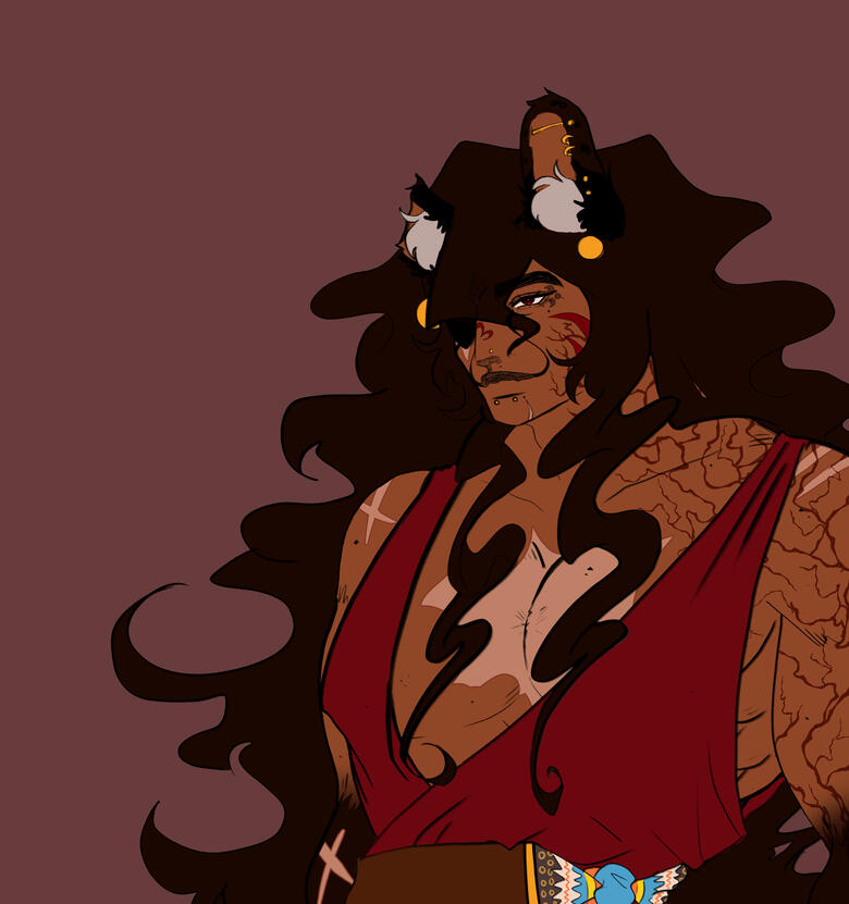 Dhezi is a handsome and beautiful man, both in masculine and feminine ways. He has a sharp jaw, piercing eyes, and full eyebrows, while also having full lips, long lashes, and beauty marks. He has clan markings along his jawline, upon the bridge of his nose, beneath his left eye, and has a flame-like symbol between his eyes that's hidden by his fringe. From his tear duct to the corners of his lips run marks with a likeness to a cheetah's facial fur.